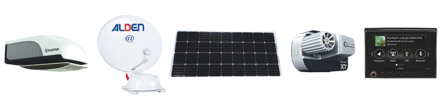 Für Ihren Komfort unterwegs haben wir spezielle Angebote für eine breite Auswahl an Zubehör vorbereitet: Klimaanlagen, Satellitenantennen, Solarpanels, Truma Mover, GPS und mehr.