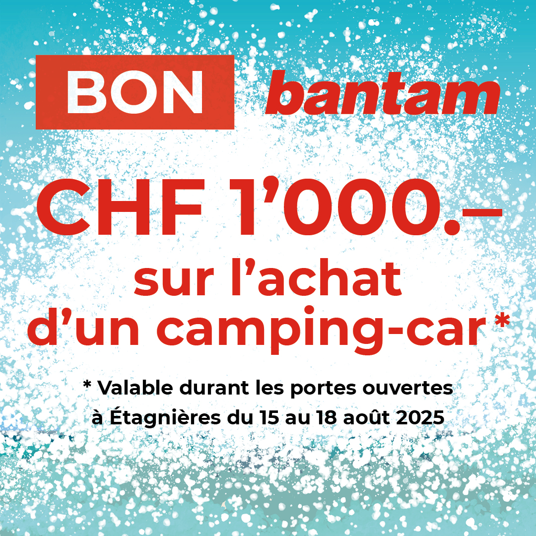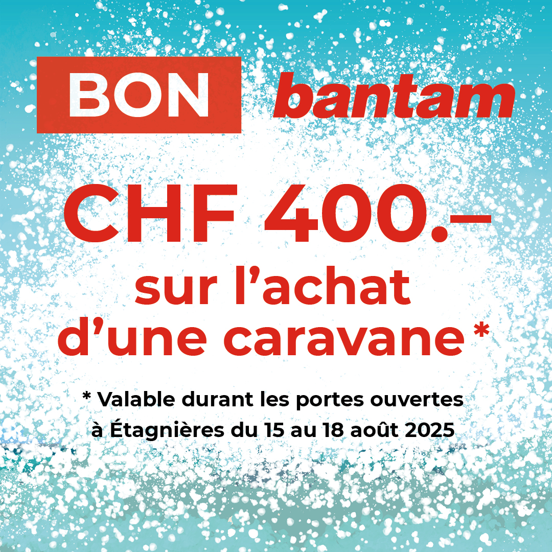 Embarquez dans l'univers Bantam lors de nos portes ouvertes et profitez de remises exceptionnelles sur plus de 600 camping-cars et caravanes, ainsi que d’une remise de -15% sur les articles de camping.*