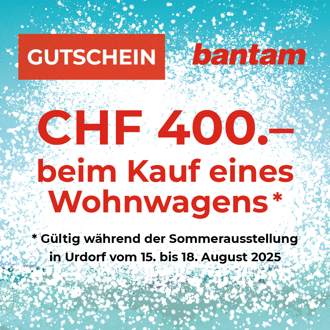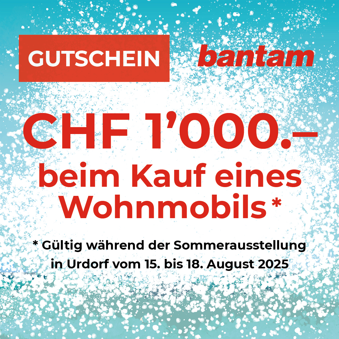 Entdecken Sie die Welt von Bantam an unserer Sommerausstellung und profitieren Sie von aussergewöhnlichen Rabatten auf eine Auswahl von über 600 Wohnmobilen und Wohnwagen und 15% Rabatt auf das Ladensortiment.*